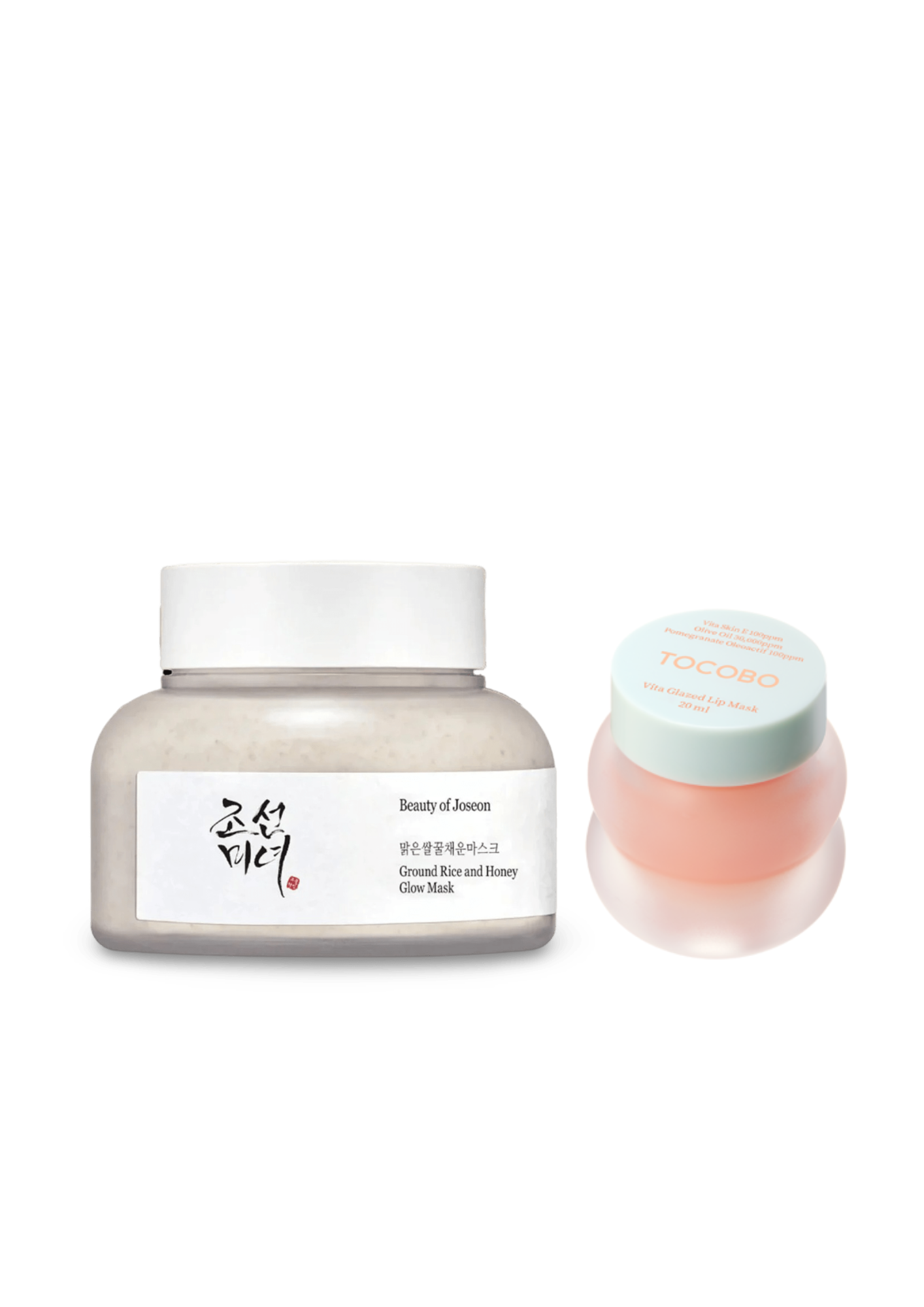 Intensyviai drėkinantis naktinis rinkinys: Beauty of Joseon Honey Glow Mask veidui ir Tocobo Vita Glazed Lip Mask lūpoms. Padeda atkurti odos drėgmę, glotnumą ir švytėjimą miegant. Idealu sausai, jautriai, pavargusiai odai.